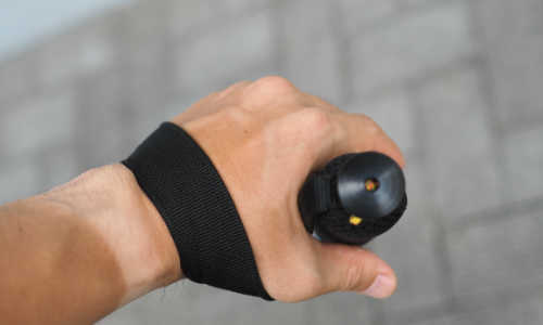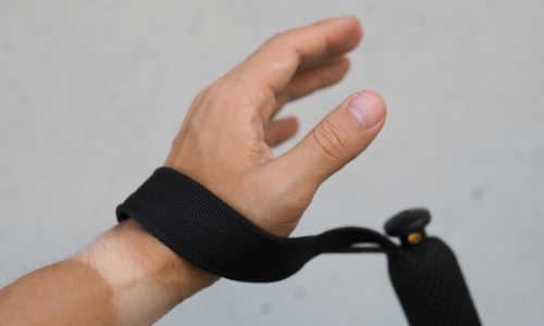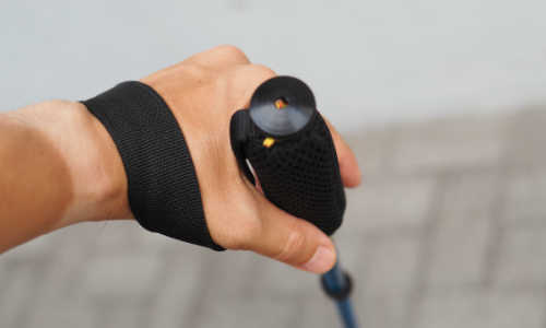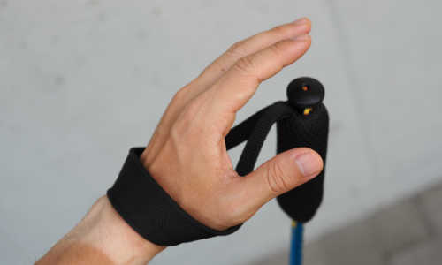 4.グリップを手の握力で強く握るではなく、手のひら側に掛かったストラップを手のひらで押すようにして、ストックに力を伝えます。最も推進力が大きく、ストックワークの基本となる握り方です。 |