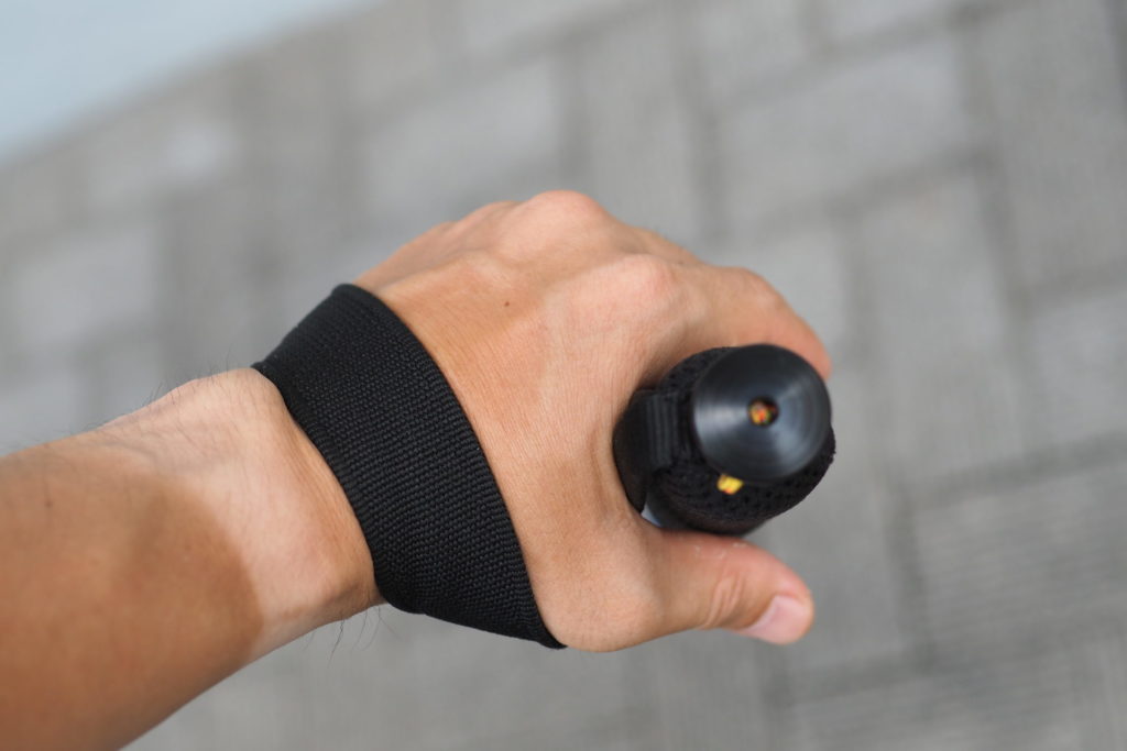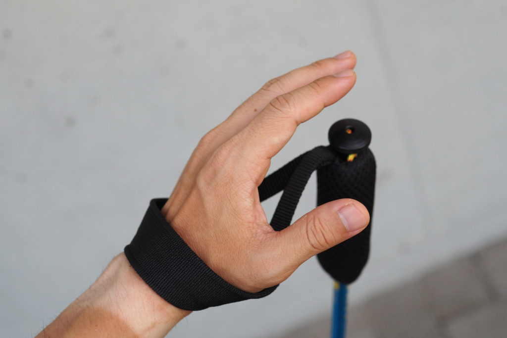 グリップを手の握力で強く握るではなく、手のひら側に掛かったストラップを手のひらで押すようにして、ストックに力を伝えます。最も推進力が大きく、ストックワークの基本となる握り方です。